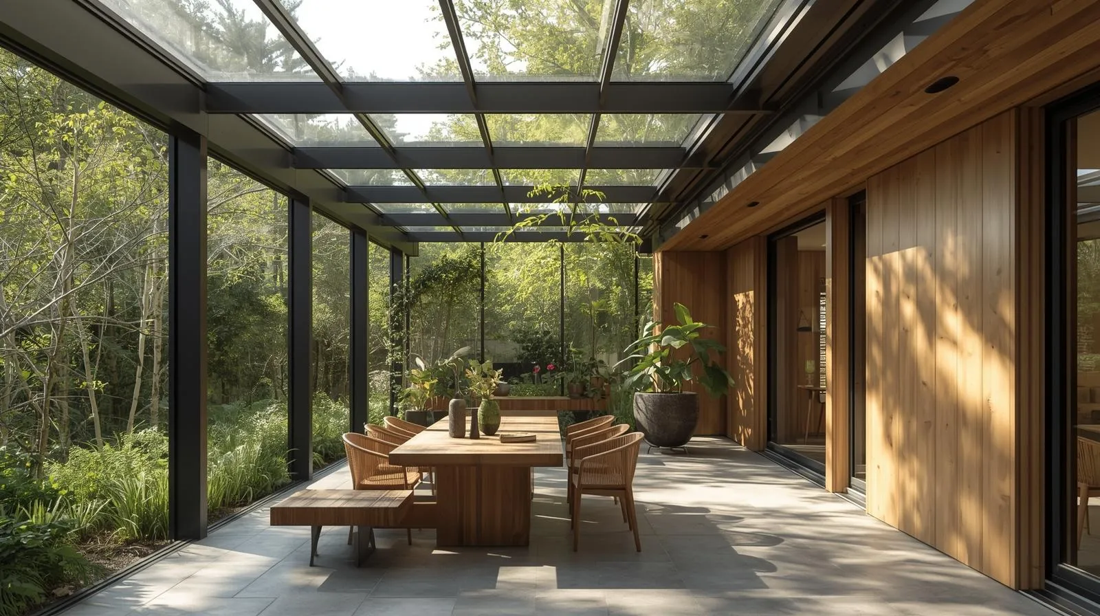 La véranda bioclimatique offre un espace lumineux entre intérieur et jardin, utilisable toute l’année grâce à une régulation thermique optimale.